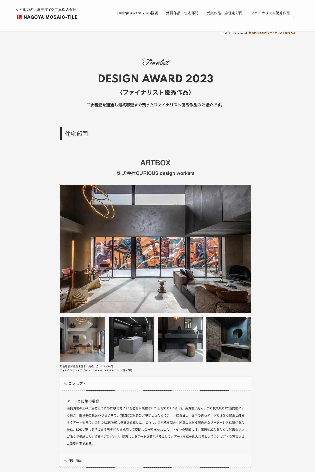 名古屋モザイクDESIGN AWARDとは日本国内外でタイルを使用した建築物や造形物など、タイルの魅力と可能性を広めるため設立されたデザインアワードです。住宅部門で「ART BOX」が優秀作品に選ばれました。優秀作品詳細についてはこちら